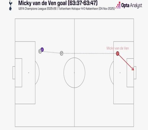 范德芬带球奔袭67.7米破门,为有统计以来欧冠最长