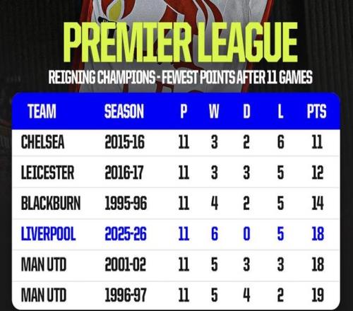 本赛季英超前11轮战罢,作为卫冕冠军的利物浦只拿到18分,英超历史上此前只有三支卫冕冠军同期拿到的积分比本赛季的利物浦更少。